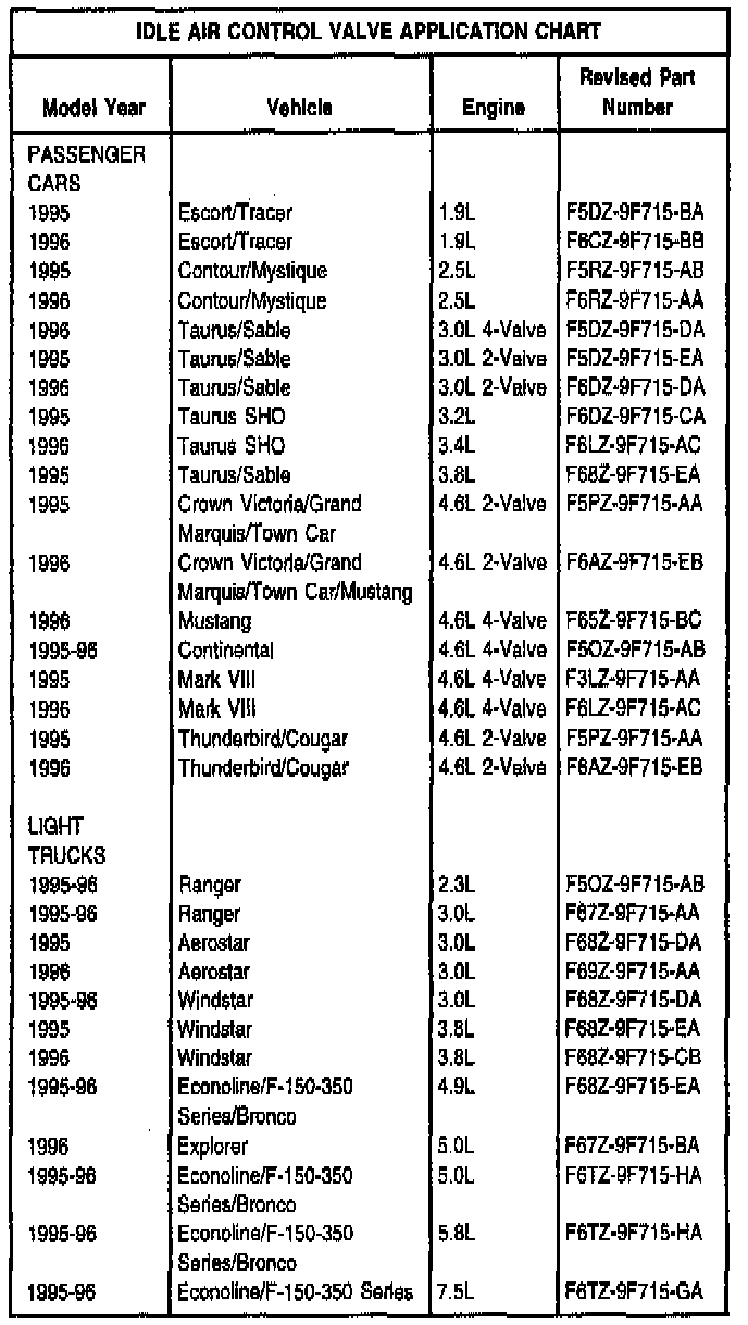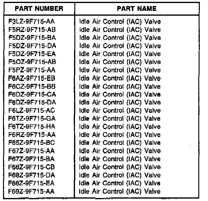 2. If no codes are present, replace the AC Valve by referring to the appropriate model/year Service Manual, Section 03-14. Refer to the following Idle Air Control Valve Application Chart for proper IAC usage.