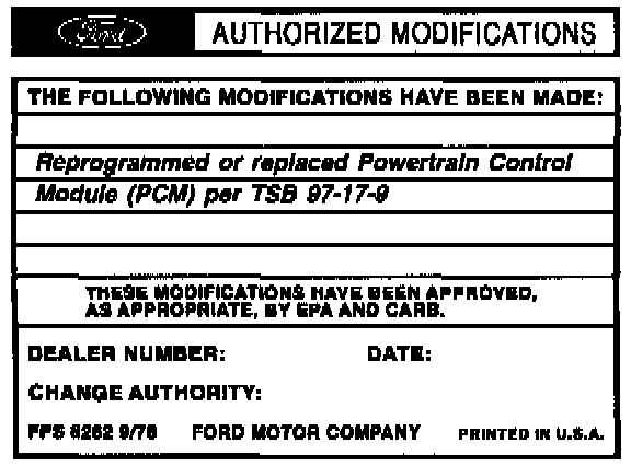 Obtain an Authorized Modification Decal (FPS 8262 - obtainable through DOES II, 25/pkg) and list the date, dealer number, and summary of modifications performed. Select a prominent place adjacent to the Vehicle Emission Control Information Decal suitable for installing the Authorized Modifications Decal. Clean the area, install the decal, and cover it with a clear plastic decal shield.
