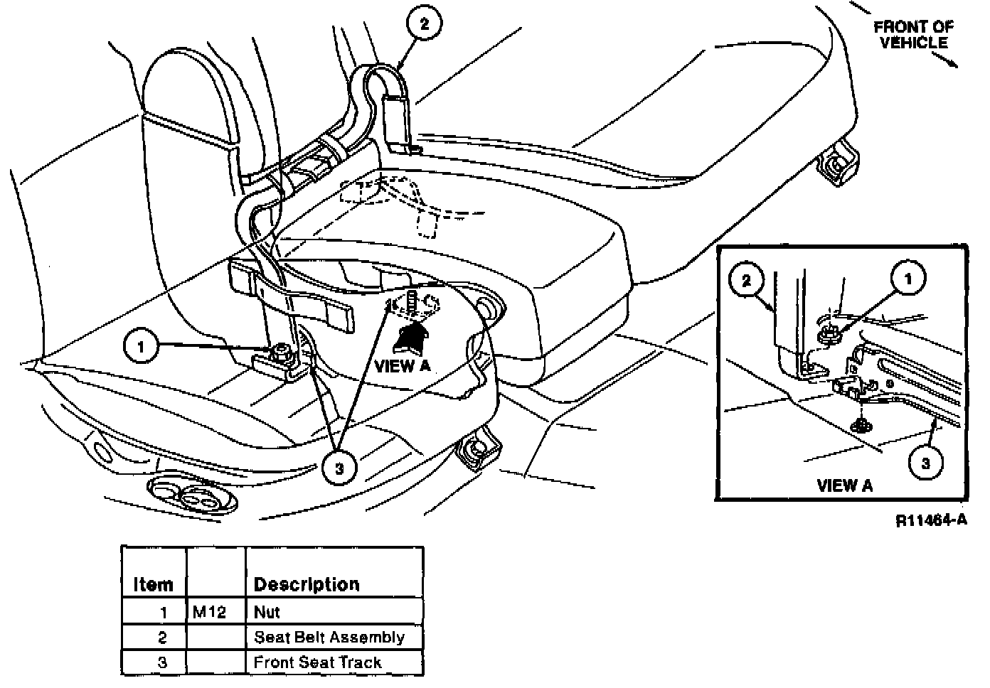 2. Remove rear inboard seat track nuts and center front seat belt.