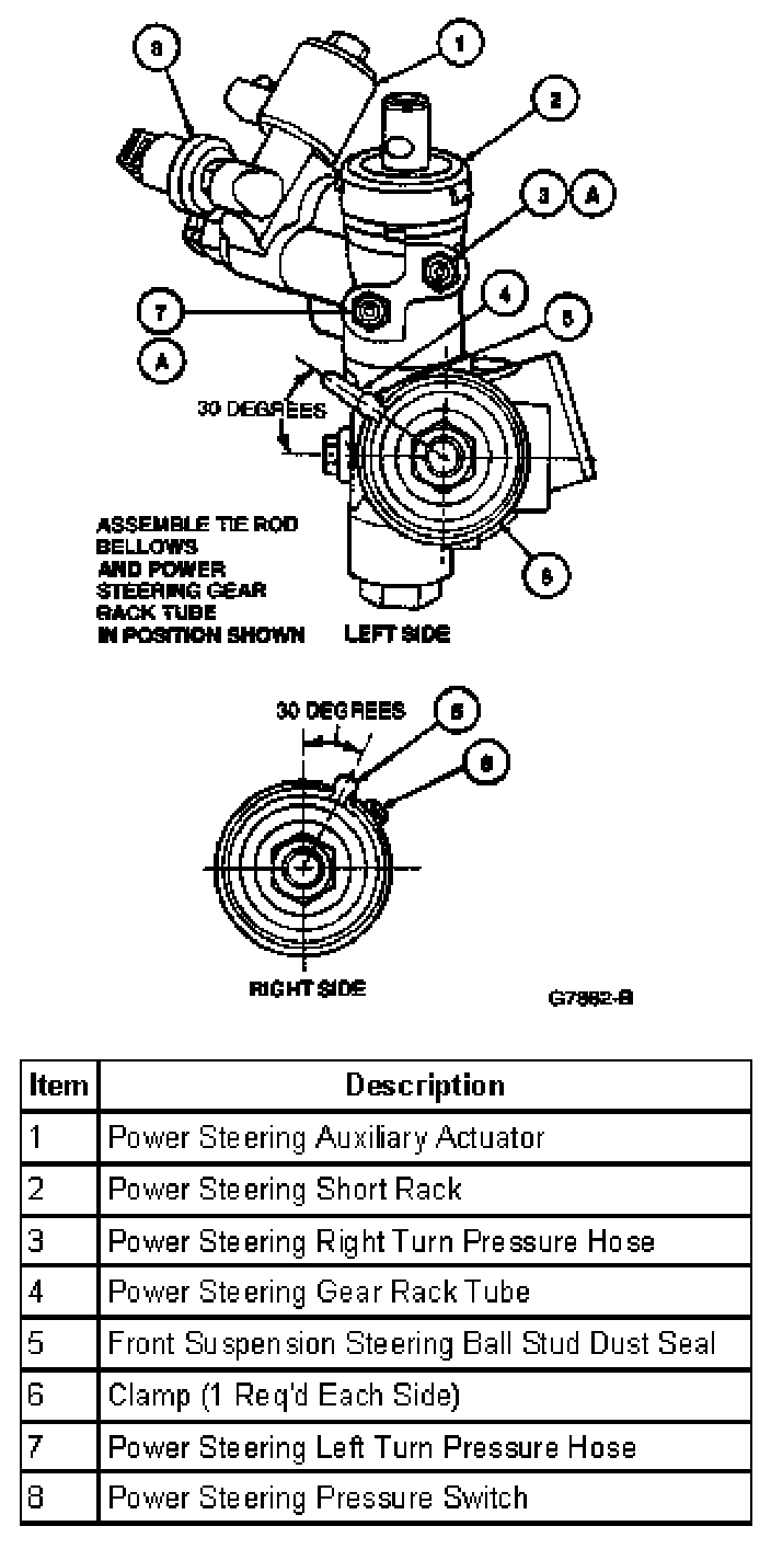 5. Install front suspension steering ball stud dust seal and power steering gear rack tube. Make sure power steering gear rack tube is positioned as shown. Make sure front suspension steering ball stud dust seal is seated in groove in tie rod. Position clamps as shown.