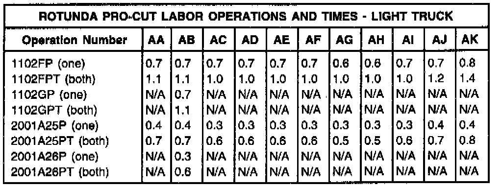 Reference list for Pro-Cut light truck labor operations: