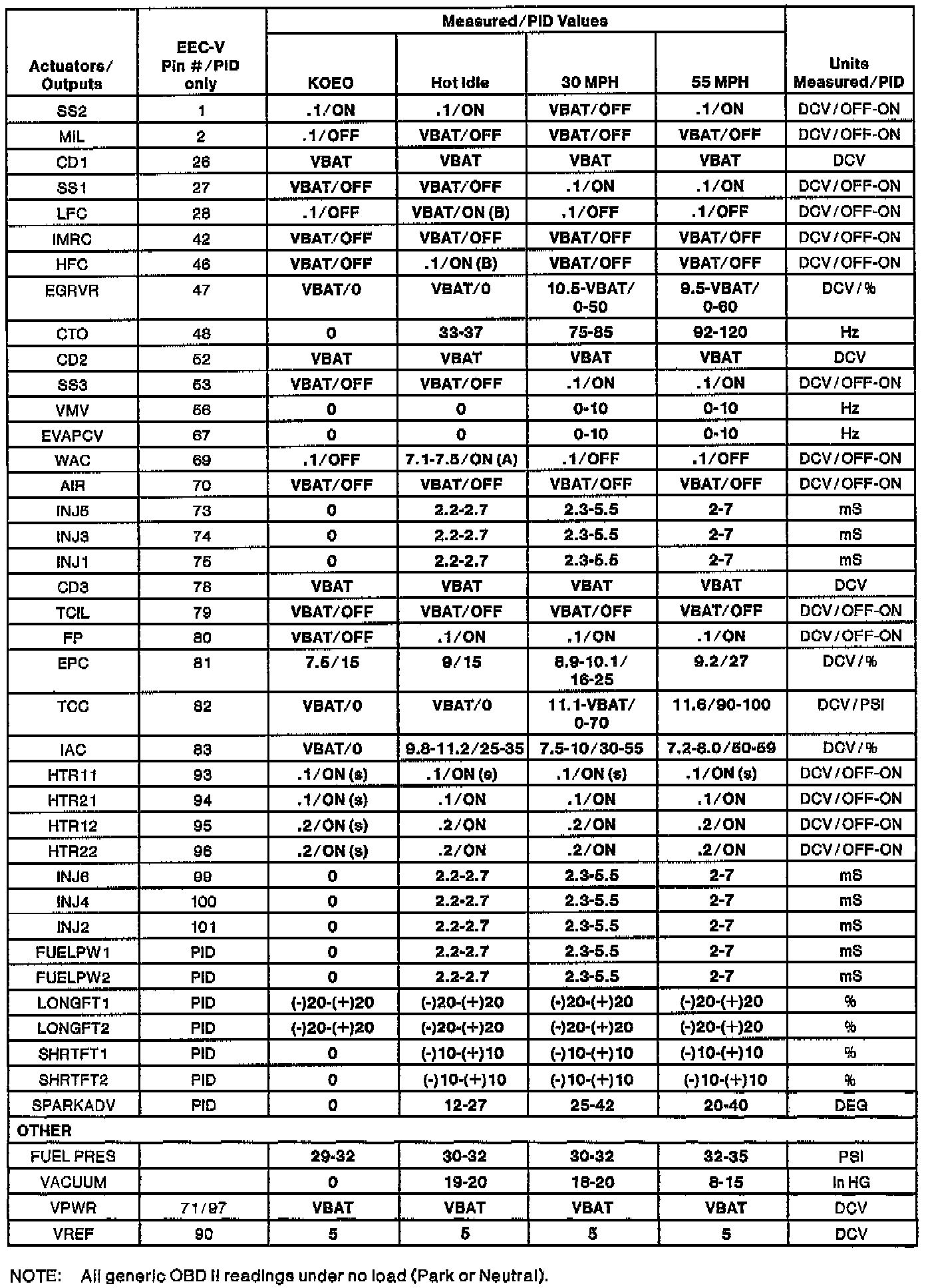 NOTE: All generic OBDII readings under no load (PARK or NEUTRAL).