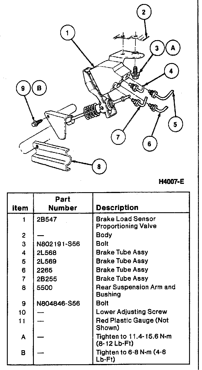 4. Position load sensing proportioning valve lower mounting bracket to rear suspension arm and bushing. Install one retaining screw. Tighten to 6-8 N.m (4-6 lb-ft). Ensure the brake pressure differential valve adjuster sleeve is resting on lower bracket and tighten lower adjuster setscrew.