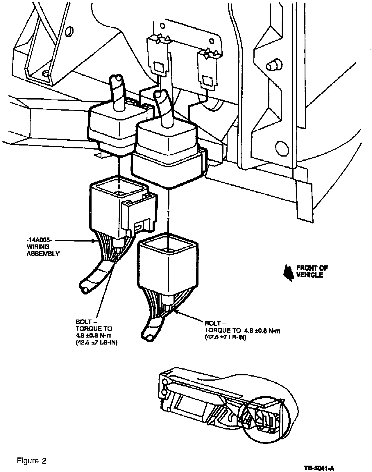 8. Reinstall the -14401- junction block connector bolt back into the junction block and torque to 4.8 +/- 0.8 N.m (42.5 +/- 7 lb-in).
