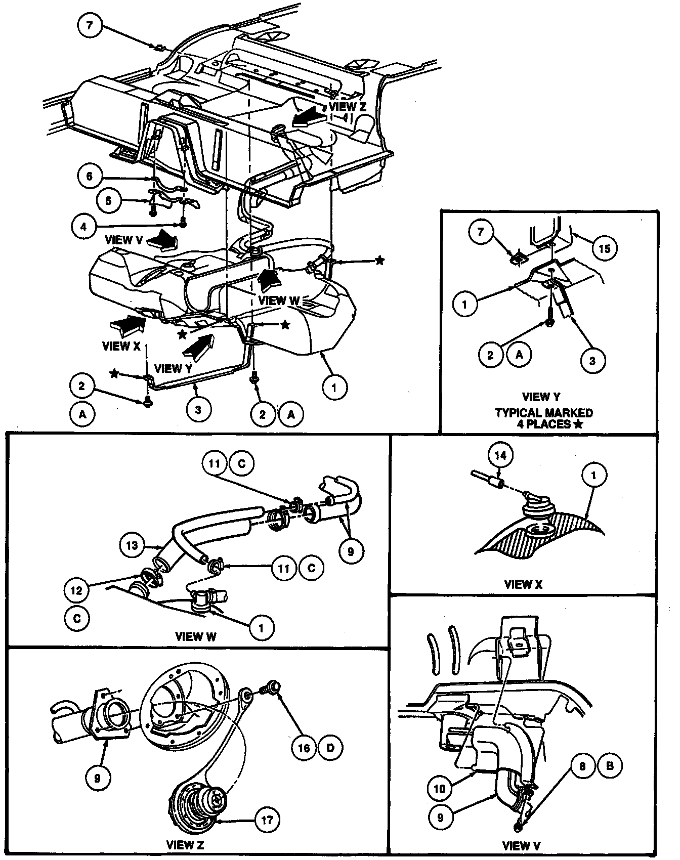 NOTE: The nylon fuel tube connections are on top of the fuel tank and are inaccessible. They must be disconnected with the fuel tank partially removed from the vehicle.