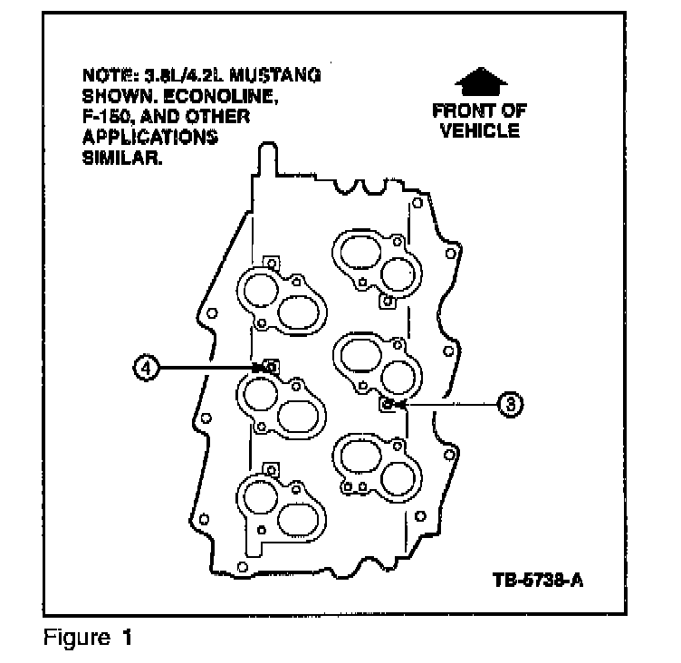 DUE TO SLIGHTLY THICKER SIDE GASKET BEAD MATERIAL, THE CENTER BOLTS (# 3 AND # 4, FIGURE 1) IN THE LOWER INTAKE MANIFOLD MUST FIRST BE INSTALLED (HAND-TIGHTENED) AND FASTENED. DRAWING DOWN THESE BOLTS FIRST, WILL FACILITATE INSTALLATION OF THE OTHER BOLTS.