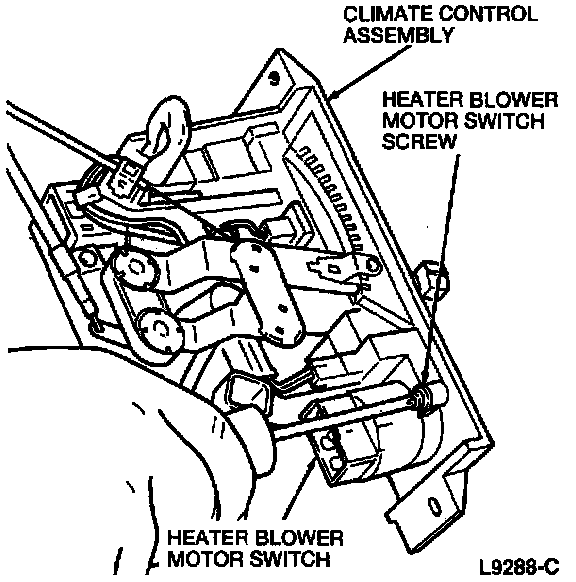 6. Remove the heater blower motor switch screw and the heater blower motor switch from the climate control assembly.