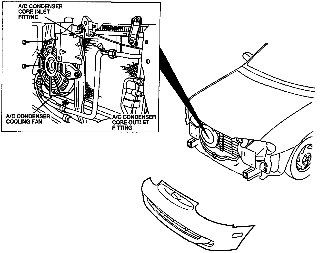 4. Disconnect the jumper line at the A/C condenser core outlet fitting. Discard the O-ring.