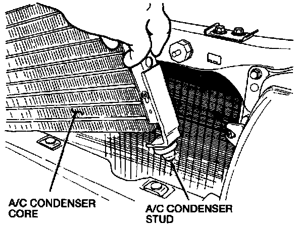 10. Lift the A/C condenser core to allow the A/C condenser studs to clear their mounts and remove the A/C condenser core from the vehicle.