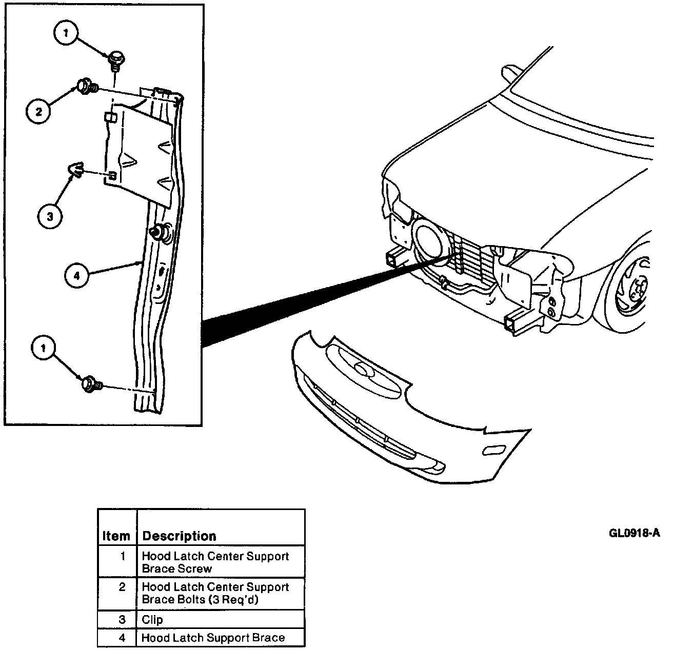 6. Remove the two bolts, nut, screw, clip, and the hood latch support brace from the vehicle.
