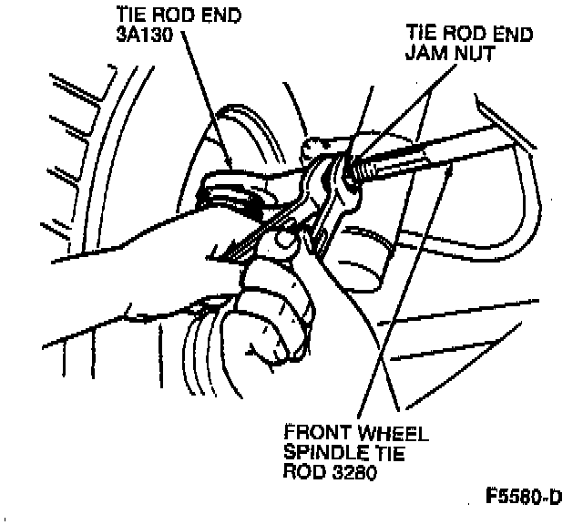 1. With paint or marking pen, mark both tie rod ends, front wheel spindle tie rods, and tie rod end jam nuts in their original positions. These reference marks will help in equalizing right and left adjustments.