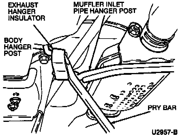 2. Use a pry bar to remove the muffler inlet pipe hanger posts from the exhaust hanger insulators. Use the body hanger post as a pry point.