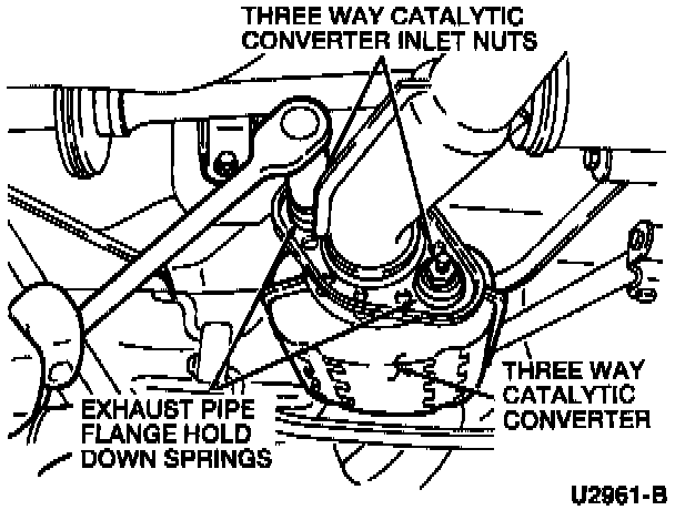 6. Install the two exhaust pipe flange hold down springs and the two three way catalytic converter inlet nuts. Tighten the two three way catalytic converter inlet nuts to 38-53 Nm (28-38 lb ft).
