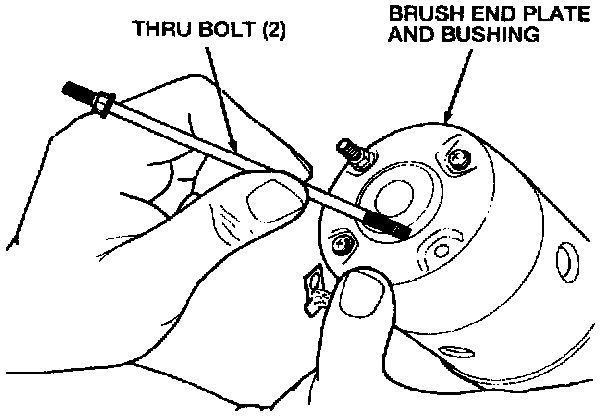 7. Remove the two thru bolts and the brush end plate and bushing.