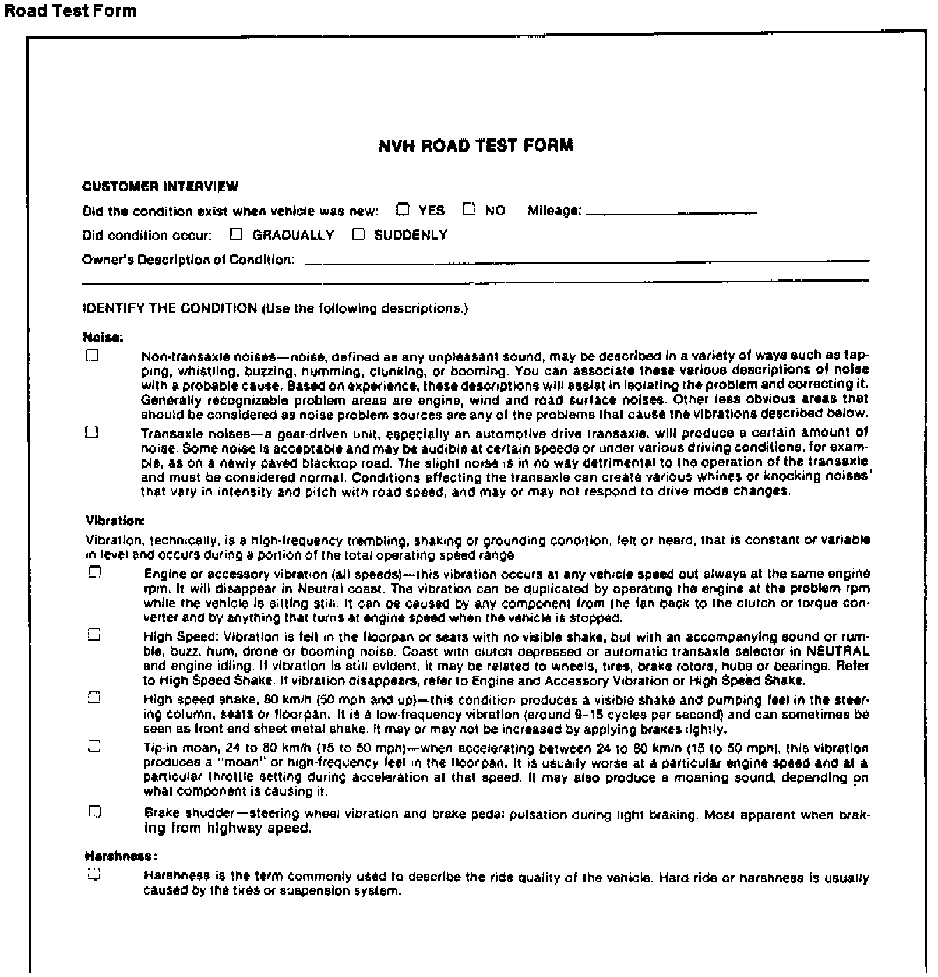 1. Make notes throughout the diagnosis routine. It will help cover all the bases when starting to add up the clues. Use a photocopy of the NVH Road Test Form included. Make sure to write down even the smallest bit of information; it may turn out to be very important.
