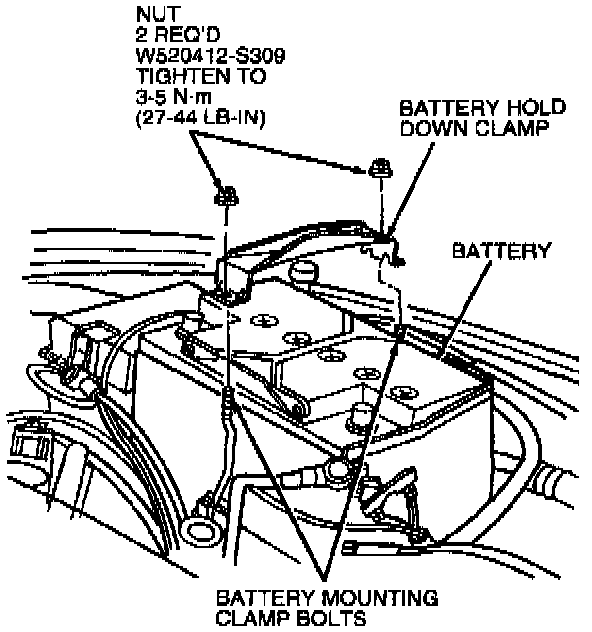 3. Place battery with positive and negative terminals in same position as previous battery. Assemble and tighten hold-down battery clamp retaining nuts to 3-5 Nm (27-44 lb-in). Do not over-tighten.