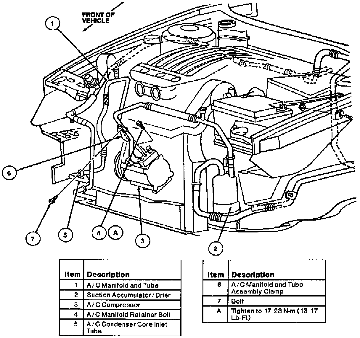 4. Position A/C manifold and tube with O-ring seals to A/C compressor. Install retaining bolt and tighten to 17-23 N.m (13-17 Lb-Ft).