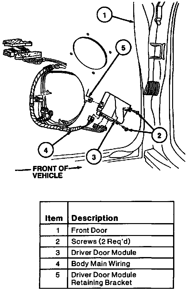 4. Remove two screws retaining driver door module to front door. Remove driver door module.