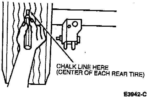 1. Raise the vehicle on a hoist to allow the rear axle housing be freely suspended.2. Using white chalk or paint, mark a small area at the center of each rear tire and draw a vertical line on it.