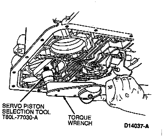 c. Install Servo Piston Selection Tool T80L-77030-A. Tighten the band apply bolt on Servo Piston Selection Tool T80L-77030-A to 5.6 Nm (49 inch lbs.).