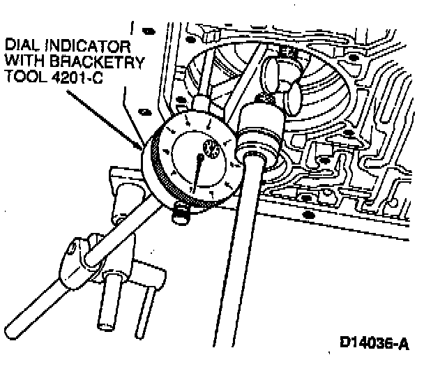 d. Attach Dial Indicator with Bracketry TOOL-4201-C or equivalent and position the indicator stem on the flat portion of the piston. Zero the dial indicator.