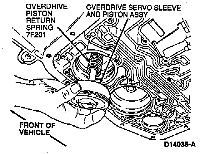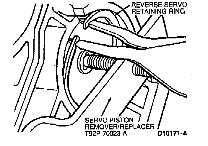 5. Install overdrive servo piston return spring and overdrive servo piston assembly. Verify tip of piston assembly engages the pocket of overdrive band. Using Servo Piston Remover/Replacer T92P-70023-A, install piston assembly into the case and compress overdrive servo piston return spring.