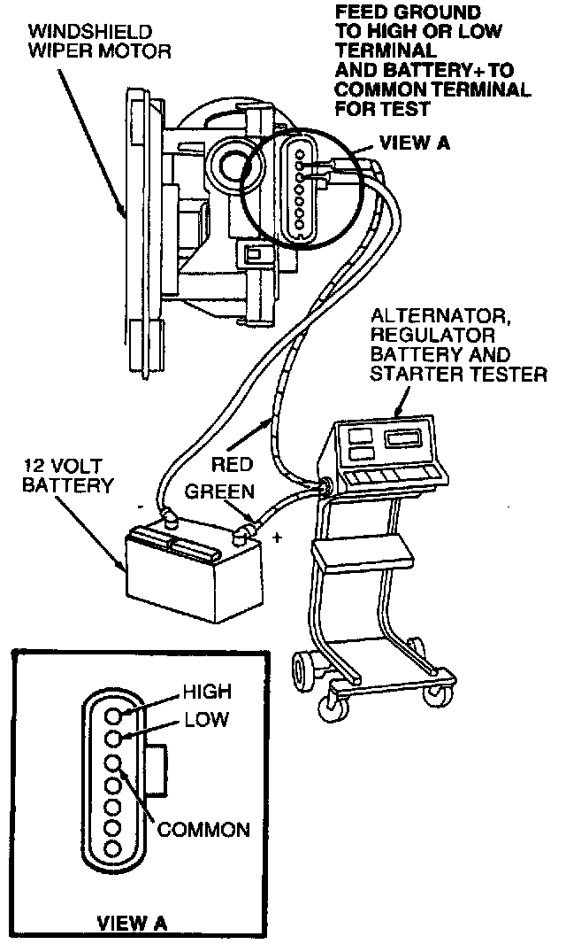 CAUTION: Do not handle any windshield wiper motor abusively when diagnosing wiper operations, as it will damage the magnets and make the windshield wiper motor inoperative. Rough handling of new replacement windshield wiper motors may also damage the magnets.