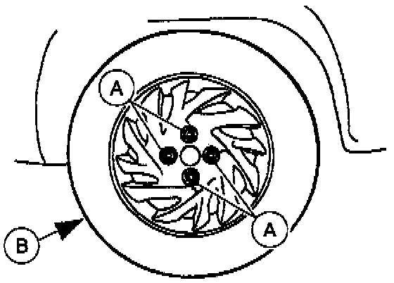 3. Remove the four lug nuts (A) and the wheel and tire assembly (B).