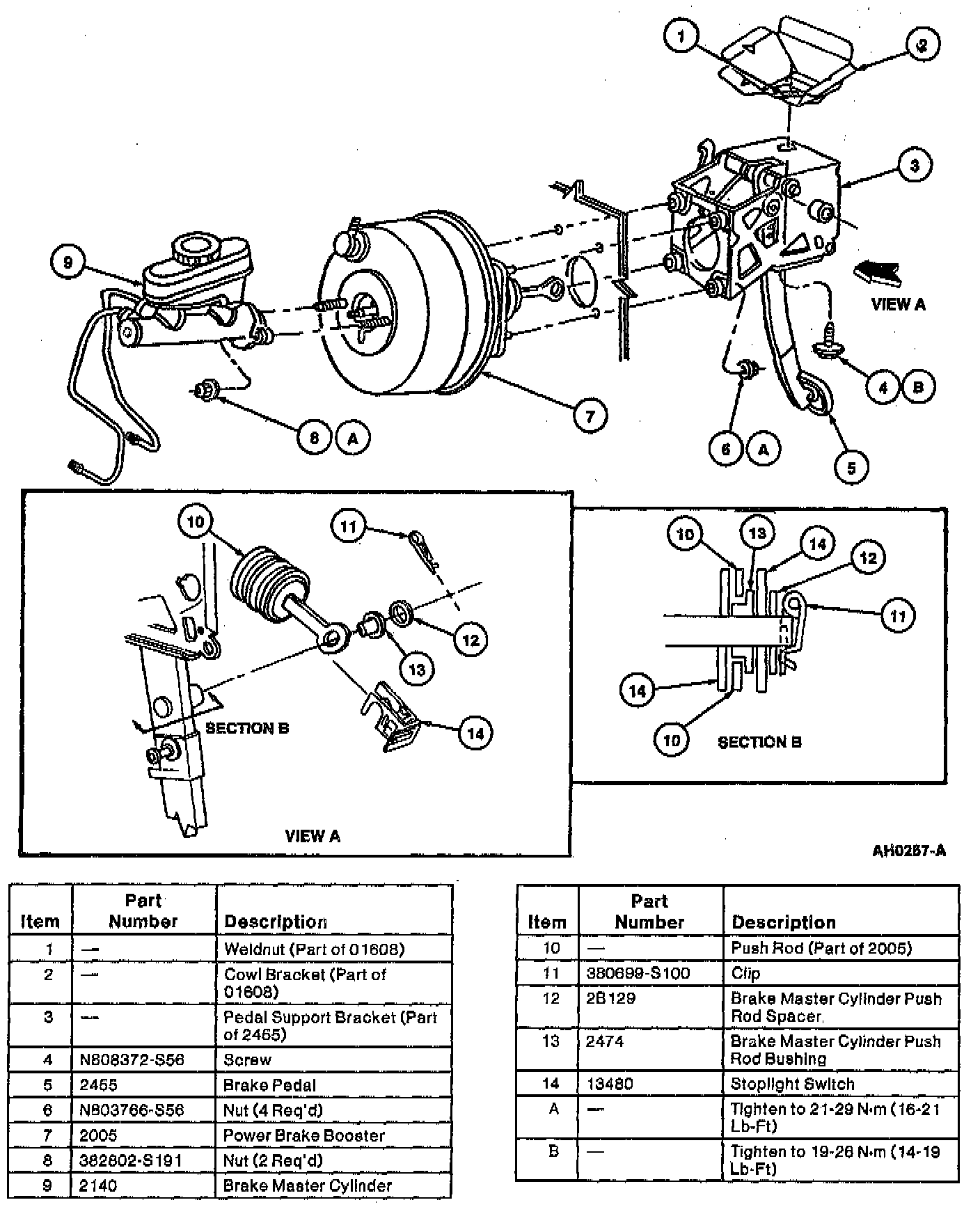 4. Install two retaining nuts on upper booster studs and retaining screw for pedal and bracket to cowl. Tighten four retaining nuts to 21-29 Nm (16-21 ft. lbs.) starting with top right retaining nut and working counterclockwise.