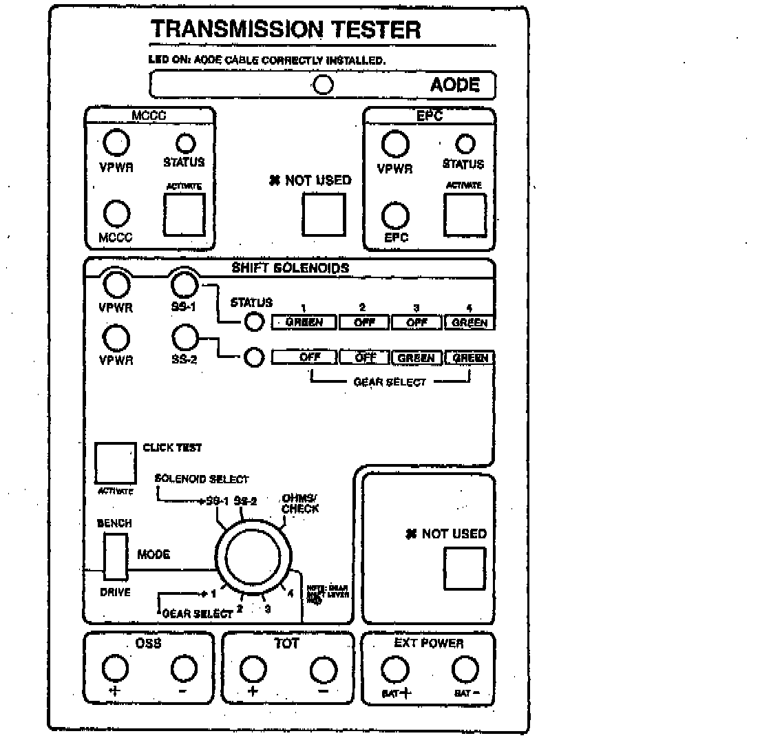 5. Solenoid Select/Gear Select Switch: Has three functions. In BENCH MODE: acts as shift solenoid selector for click testing. In DRIVE MODE: acts as forward gear selector in place of vehicle's PCM-controlled shifting. Hydraulic safety mechanisms and overrides are built in to the transmission. In OHMS CHECK: allows you to measure resistance (ohms).