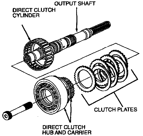 The direct clutch couples the input shaft to the planet carrier (through the stub shaft) in third and fourth Gears.
