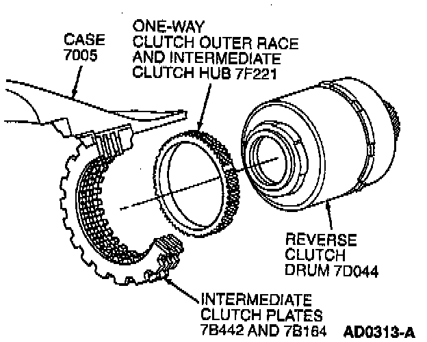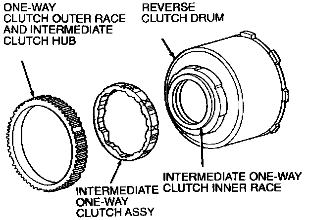 The intermediate one-way clutch is a roller clutch that works with the intermediate friction clutch to hold the reverse sun gear stationary in second gear during acceleration. This one-way clutch freewheels in third gear and during coasting in second gear, O/D and D ranges.