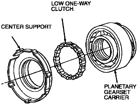 The planetary (low) one-way clutch is a roller clutch that holds the pinion carrier stationary in first gear, (O/D and D ranges). During automatic coasting downshifts into first gear (O/D and D ranges), it freewheels so that there is no engine braking.