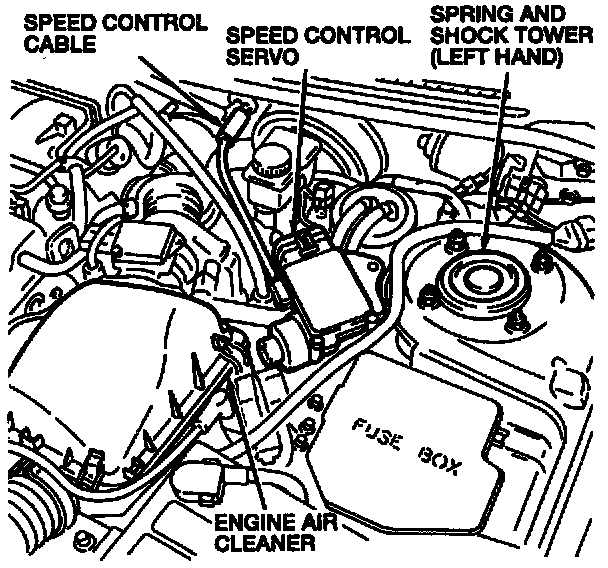 The speed control servo receives battery voltage. Ground is supplied through the powertrain control module (PCM). The speed control servo controls vehicle speed through a motor driven cable to the accelerator pedal assembly. The speed control servo determines control from operator input (switches) and vehicle speed sensor. Speed control is temporarily shut off (memory saved for RSM function) when a 12 volt signal is received from the BOO switch.