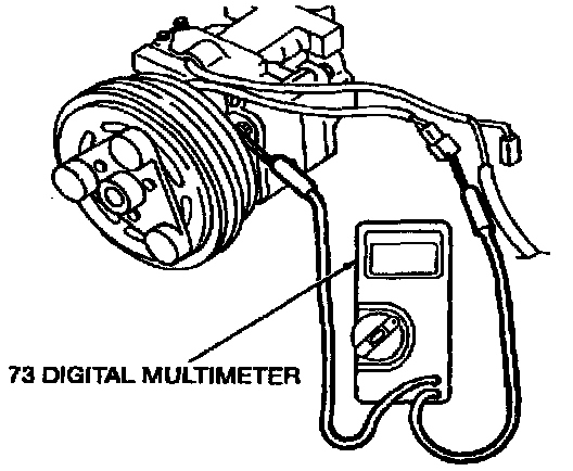 1. Set the A/C compressor on a level surface.2. Check the resistance between the clutch field coil electrical connector and a ground with Rotunda 73 Digital Multimeter 105-R0051 or equivalent. The resistance should be approximately 3 to 4 ohms at 20°C (68°F). If the resistance is not as specified, replace the A/C clutch field coil.