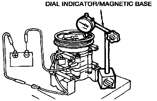5. The clutch hub to A/C clutch pulley clearance is equal to the difference between the dial indicator readings when applying and removing 12 volts. Clearance should be between 0.4-0.5mm (0.016-0.019 inch). Add or remove shims as necessary.