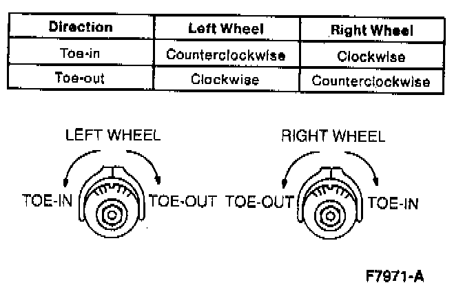 2. Turn the adjusting cam bolt as indicated in the following chart to adjust the toe to the correct specifications.