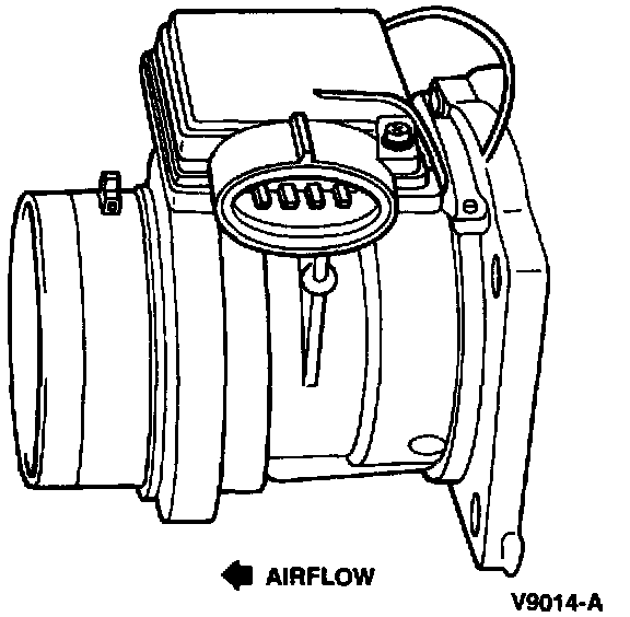 The MAF sensor is located directly in the air flow path between the air cleaner housing and the throttle body. All air entering the intake manifold must pass through the sensor. Located in the MAF sensor directly in the airstream are two platinum wires, a hot wire heated by electrical current and a cold reference wire. The MAF sensor uses the air flow across these wires to calculate its output.