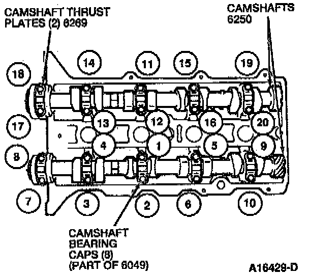 Install the camshaft thrust plates and the camshaft bearing caps. Tighten the camshaft bearing cap bolts and the camshaft thrust plate bolts in three steps, in the sequence shown.