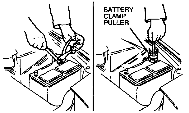 Use a battery clamp puller to remove a battery cable clamp from the battery terminal. With the jaws gripping the underside of the battery cable clamp, pull the battery cable clamp up by means of pressure exerted against the top of the battery terminal. Proper use of this tool avoids the damaging lateral or twisting forces that result when using a pry bar or pliers.