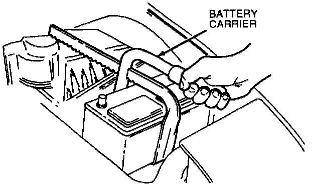 Use a suitable battery carrier for lifting and transporting the battery. The illustration shows a clamp-type carrier used to grip the sidewalls of the container just below the lip of the cover. The battery carrier is used on the sidewalls, rather than the end walls, since the sidewalls have additional strength from the inner cell partitions. This is particularly important with the plastic-cased battery which has end walls that are flexible.