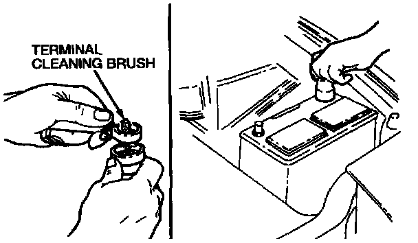 The terminal cleaning brush is designed with units to clean both the tapered battery terminal and the mating surface of the battery cable clamp.