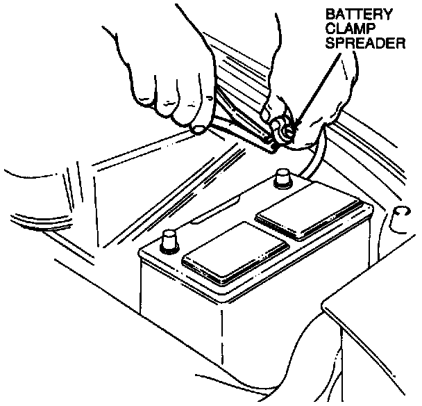 Battery pliers have jaws specifically designed for gripping battery cable clamp bolts securely. Care should be taken when removing or replacing the battery cable clamp bolts so that the battery terminals are not subjected to any excessive lateral or twisting forces. Such forces could cause major damage to the internal components of the battery, and leakage at the battery terminals.