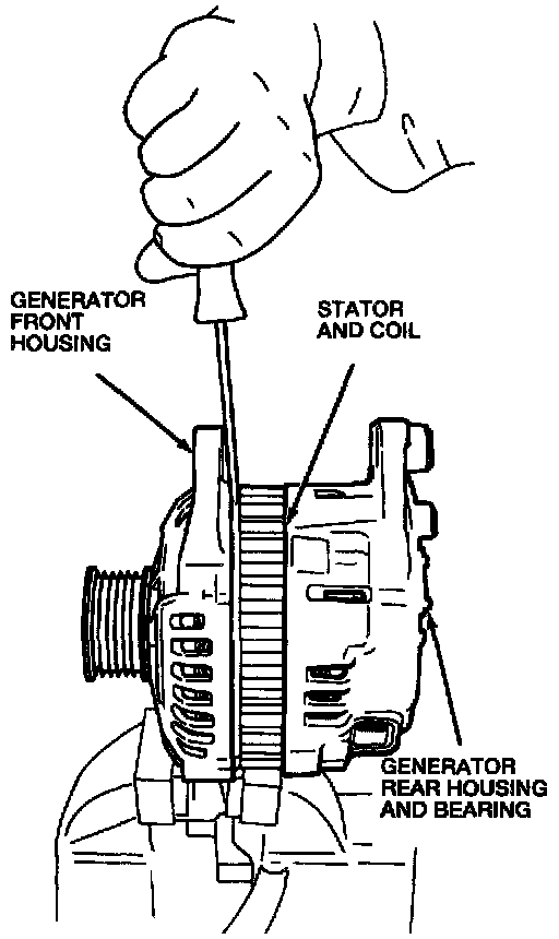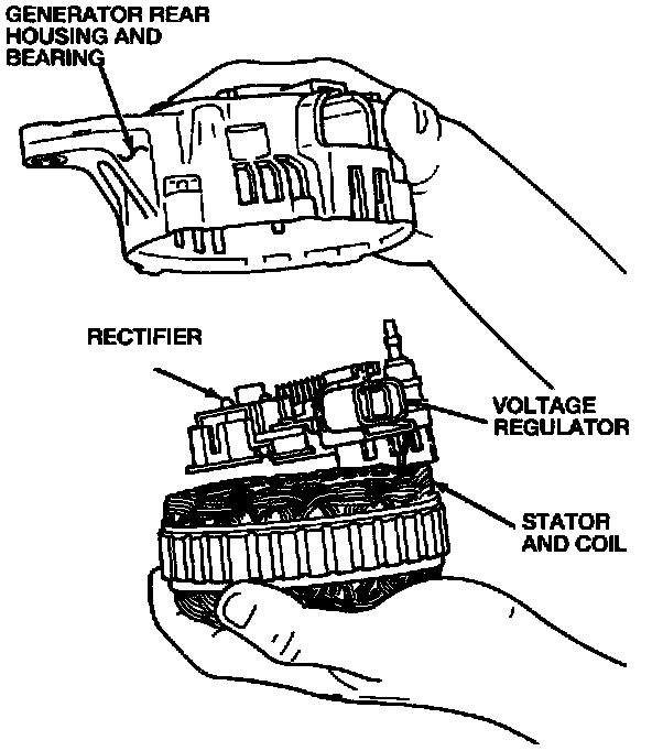 12. Remove the stator and coil, with the voltage regulator and rectifier attached, from the generator rear housing and bearing.