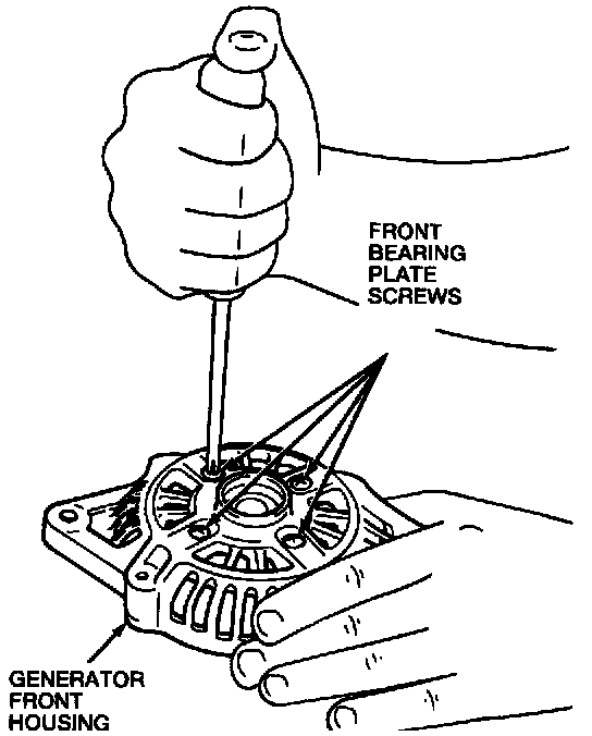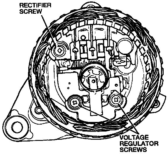 11. Remove the rectifier screw and the two voltage regulator screws that secure the voltage regulator (VR) and rectifier to the generator rear housing and bearing.