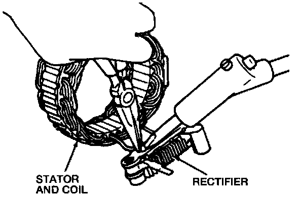 Use only rosin core solder. Hold the stator and coil leads with a pair of needlenose pliers when soldering. The pliers act as a heat sink, and will protect the diodes. Do not solder for more than 5 seconds.