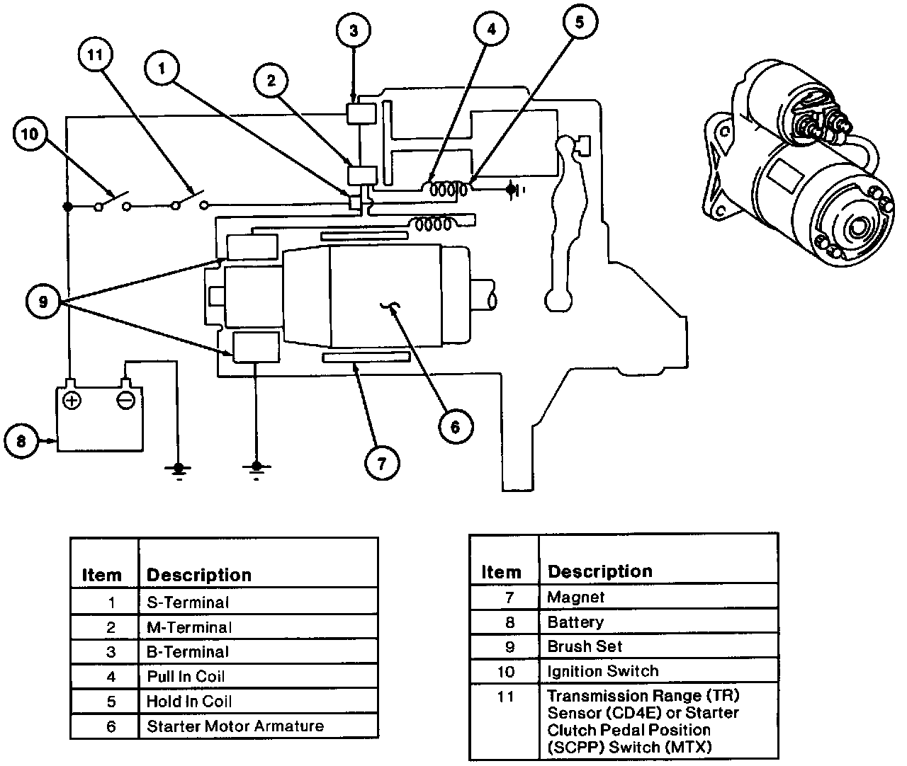When the starter solenoid is energized, a magnetic field is created in the starter solenoid windings. The iron plunger core is drawn into the starter solenoid coil, and a drive lever connected to the starter drive engages the starter drive to the flywheel ring gear. When the plunger is pulled all the way in, its contact disk closes the circuit between the battery and starter motor feed terminals. This sends current to the starter motor, and the starter drive cranks the flywheel to start the engine. When current flows to the starter motor, the starter solenoid pull-in coil is bypassed, and the hold-in coil keeps the starter drive engaged with the flywheel until the ignition switch is released from the START position. An overrunning clutch in the starter drive protects the starter motor from excessive speeds during the brief period before the driver releases the ignition switch from the START position.