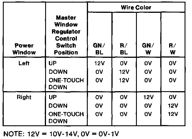 4. Check that the voltage at the master window regulator control switch as specified in the illustration, while moving the switch.