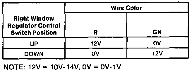 5. Check that the voltage at the right window regulator control switch as specified in the illustration, while moving the switch.