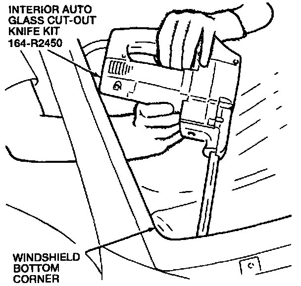 14. Use Rotunda Interior Auto Glass Cut-Out Knife Kit 164-R2450 or equivalent to cut out the windshield glass. Carefully insert the blade into the urethane. Slowly work around the windshield glass.